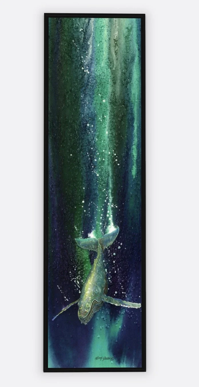 Between the fire in the sky and the whales down below, I like to imagine the beauty of two whales dancing beneath the snow capped glaciers in Alaska. This was a fun imaginative creation from my artist’s point of view.